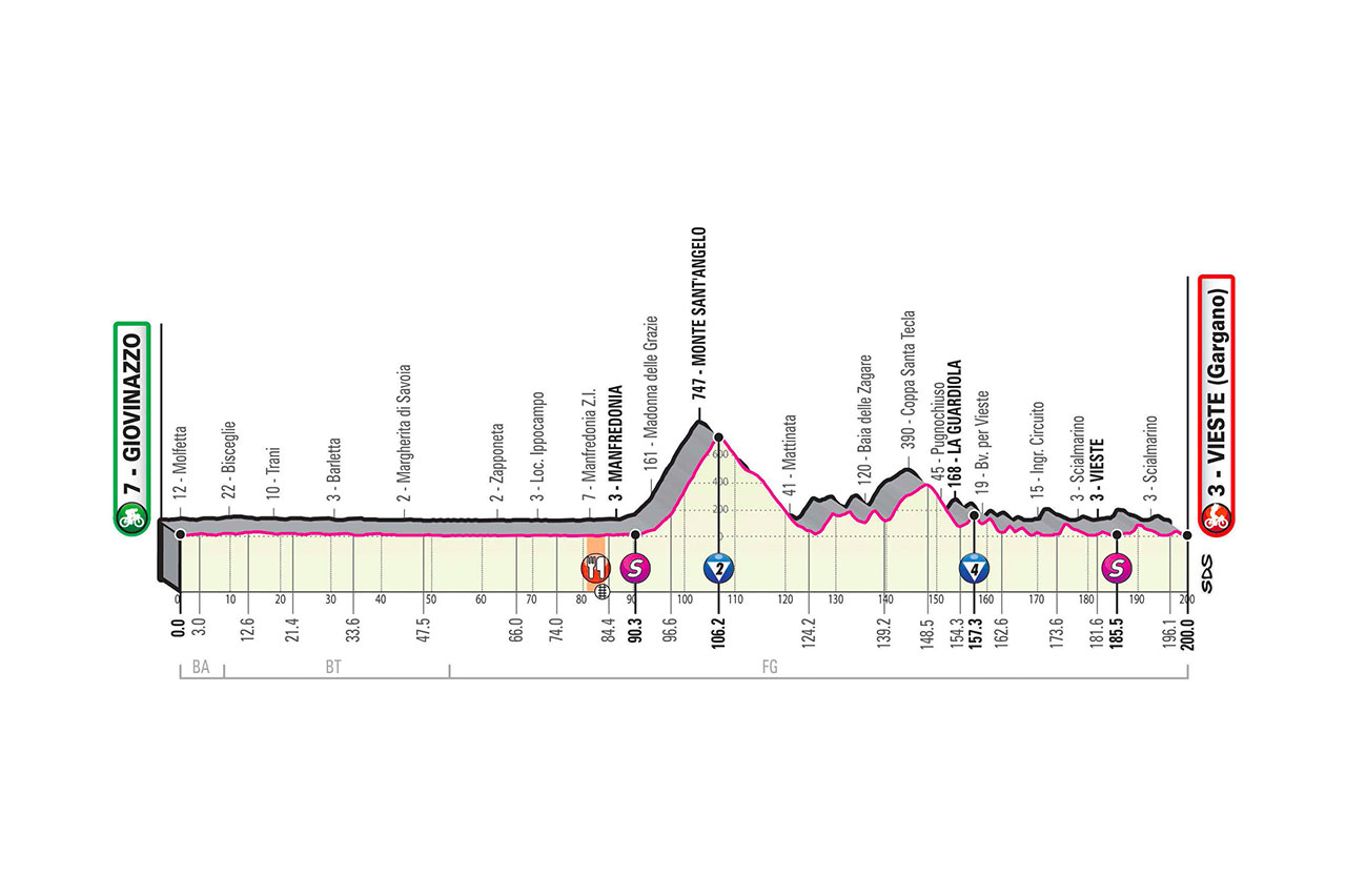 Il percorso e l’altimetria dell’ottava tappa del Giro d’Italia 2020, da Giovinazzo a Vieste dopo 200 chilometri. Una frazione divisa praticamente a metà dal GPM di seconda categoria di Monte Sant’Angelo (quasi dieci chilometri al 6% di media) che dà il via ad un finale decisamente nervoso e caratterizzato dal circuito conclusivo di Vieste. Potrebbe essere decisivo lo strappo di Via Saragat (1000 metri al 9% di media con punte del 17%), dal cui culmine mancheranno 10 km all’arrivo con tanto falsopiano veloce e favorevole prima dei 2000 metri finali pianeggianti.