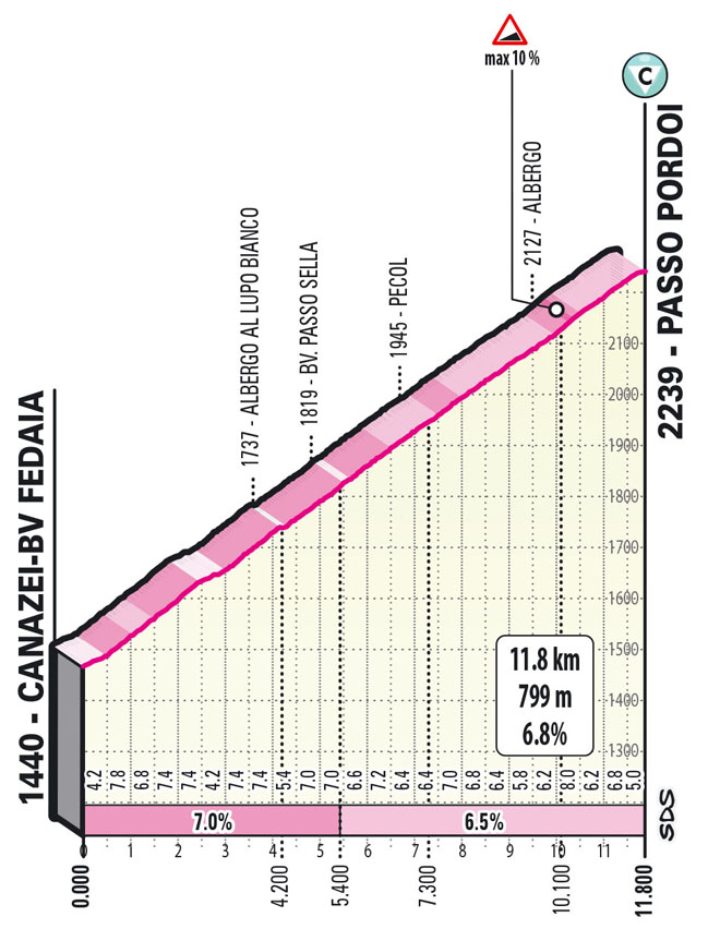 La prima asperità di giornata sarà il Passo San Pellegrino, salita di 18,5 km con una pendenza media del 6,2%. Attenzione però agli ultimi 6 km, dove la pendenza media è del 9% e ci sono punte del 15%. Dalla vetta però mancheranno ancora 86 km all’arrivo. I corridori scenderanno a Moena e inizieranno al risalita della Val di Fassa, un tratto di circa 15 km che porterà il gruppo ad attaccare la Cima Coppi del Giro 2022, il Passo Pordoi. Una salita mitica per il ciclismo italiano, lunga 11,8 km con media del 6,8% e punte del 10% ma molto costante e regolare, pericolosa se affrontata a ritmi molto elevati. Lunga discesa, inframezzata da un breve falsopiano, per andare ad attaccare la terza e ultima salita di giornata. A Caprile inizia infatti il Passo Fedaia: i primi 8 km non sono particolarmente selettivi, ma gli ultimi 5500 metri sono tra i più duri che si possano affrontare al Giro d’Italia, con rettilinei infiniti, pendenza media superiore all’11% e punte del 18%. La salita non darà tregua fino sulla linea del traguardo.